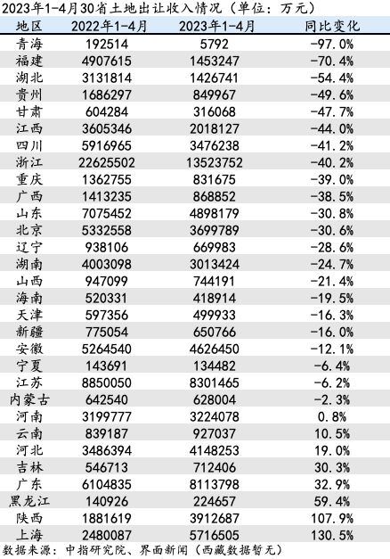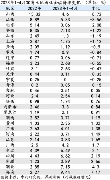 尽管供地面积大幅减少,但价格并未因此走高。中指院数据显示,1-4月,30个省份中,半数省份土地溢价率低于去年全年平均水平,剩下的省份溢价率虽高于去年水平,但涨幅多在1-2个百分点,溢价率远未能弥补供应缩量带来的收入损失。