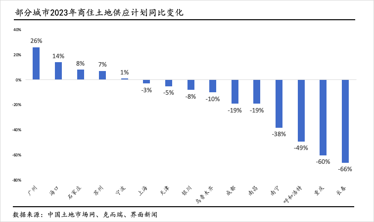 在监管的要求之下,不少城市大幅削减了今年的供地计划。比如,据克而瑞研究中心统计,截止到2022年末,长春商品住宅去化周期超过35个月,去化压力巨大,受此影响,今年长春大幅削减了供地计划,全年普通商品住宅用地计划供应量仅187公顷,比上年减少了三分之二。此外,重庆、呼和浩特、南宁等城市也面临较大的去化压力。