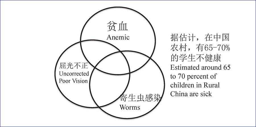 过去十多年里,REAP在19个省做了大样本调查,从青海西部到江浙沪,用10个指标衡量农村学生的营养健康状况。其中有贫血、寄生虫感染或视力问题的学生,总体占比接近70%。其中贫血27%,寄生虫感染33%,近视20%。