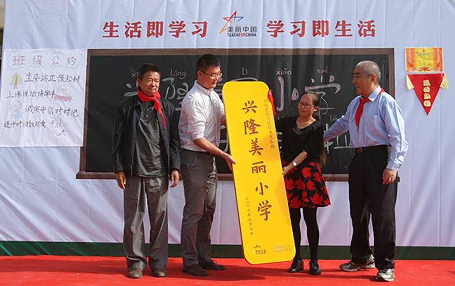 ▲ 2016年9月,美丽小学正式揭牌,最右为校长康健。 李进红