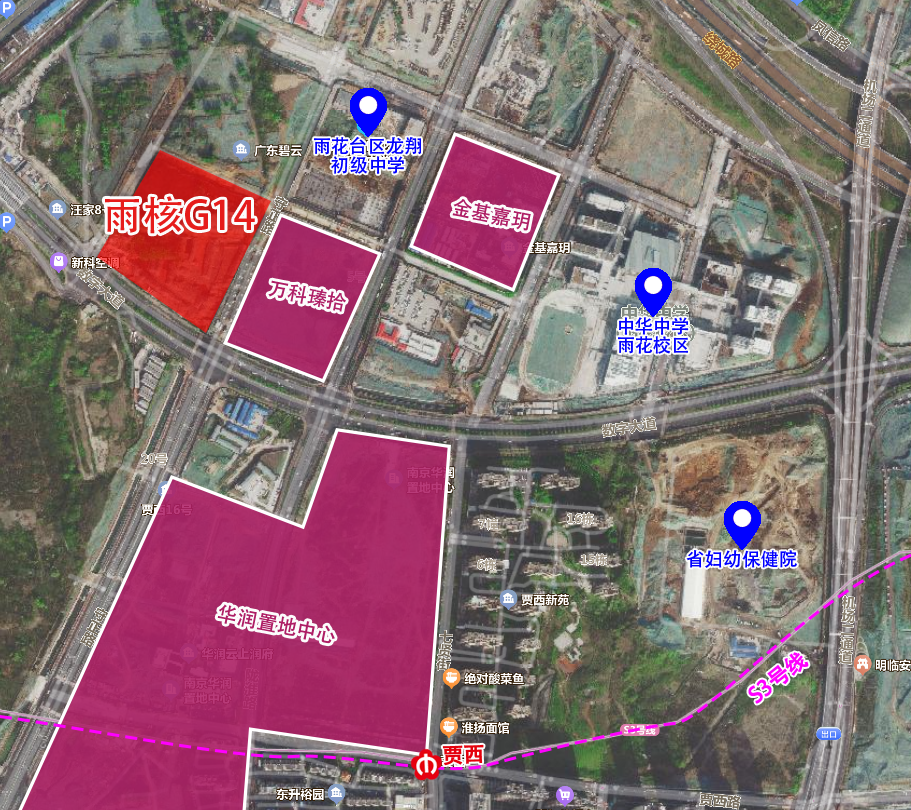 毗邻地铁S3号线贾西站,可慢行、公交、机动车多种交通方式。地块东侧紧邻规划口袋公园,东南侧在建占地约290亩的雨花城市公园,周围环境优越。