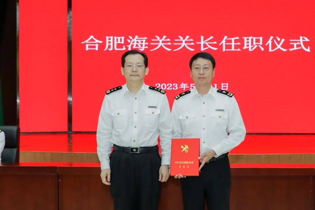 5月11日,海关总署政治部主任、党委委员许大纯出席合肥海关关长任职仪式,向合肥海关新任关长周荣球颁发任命书。