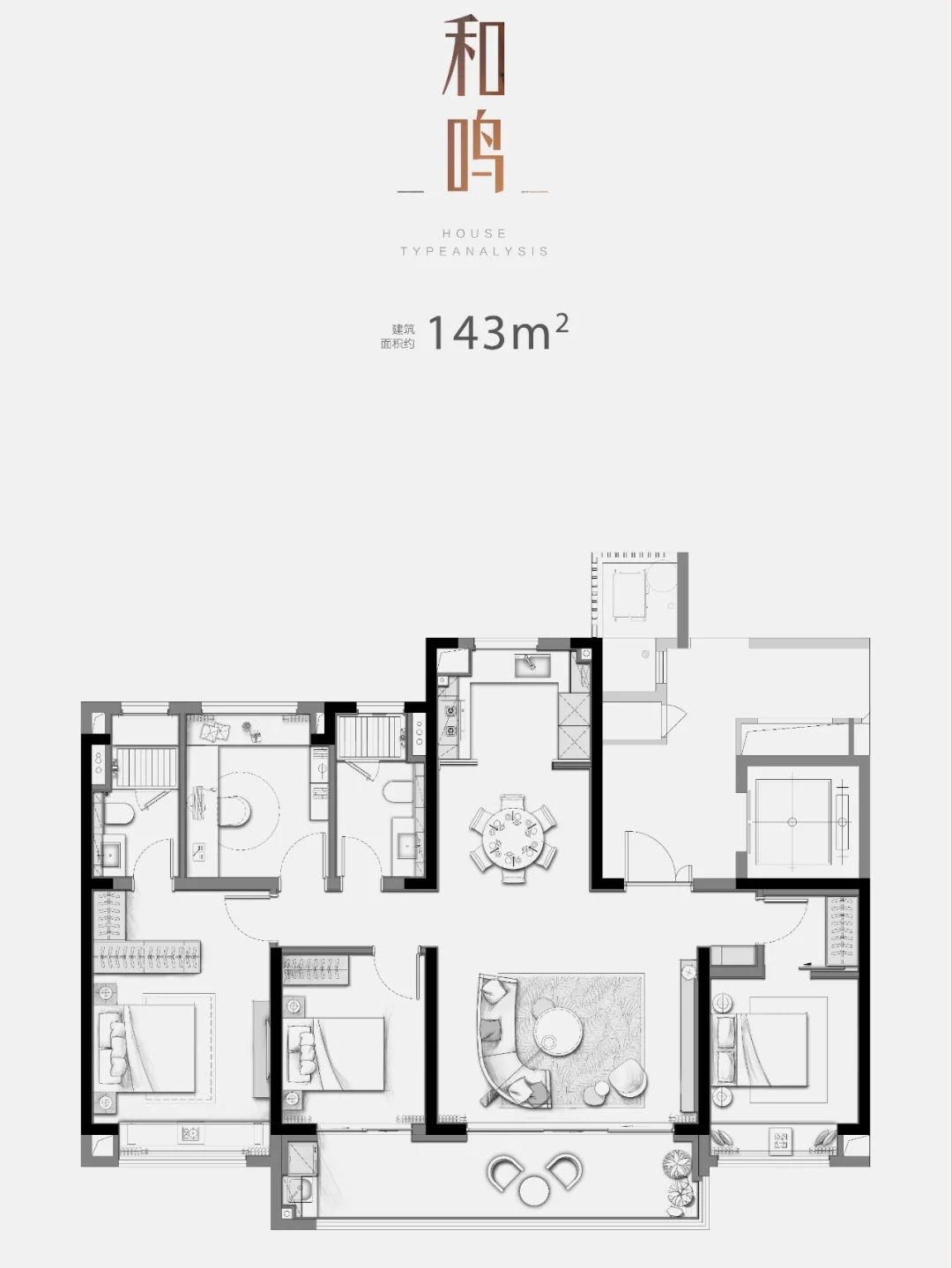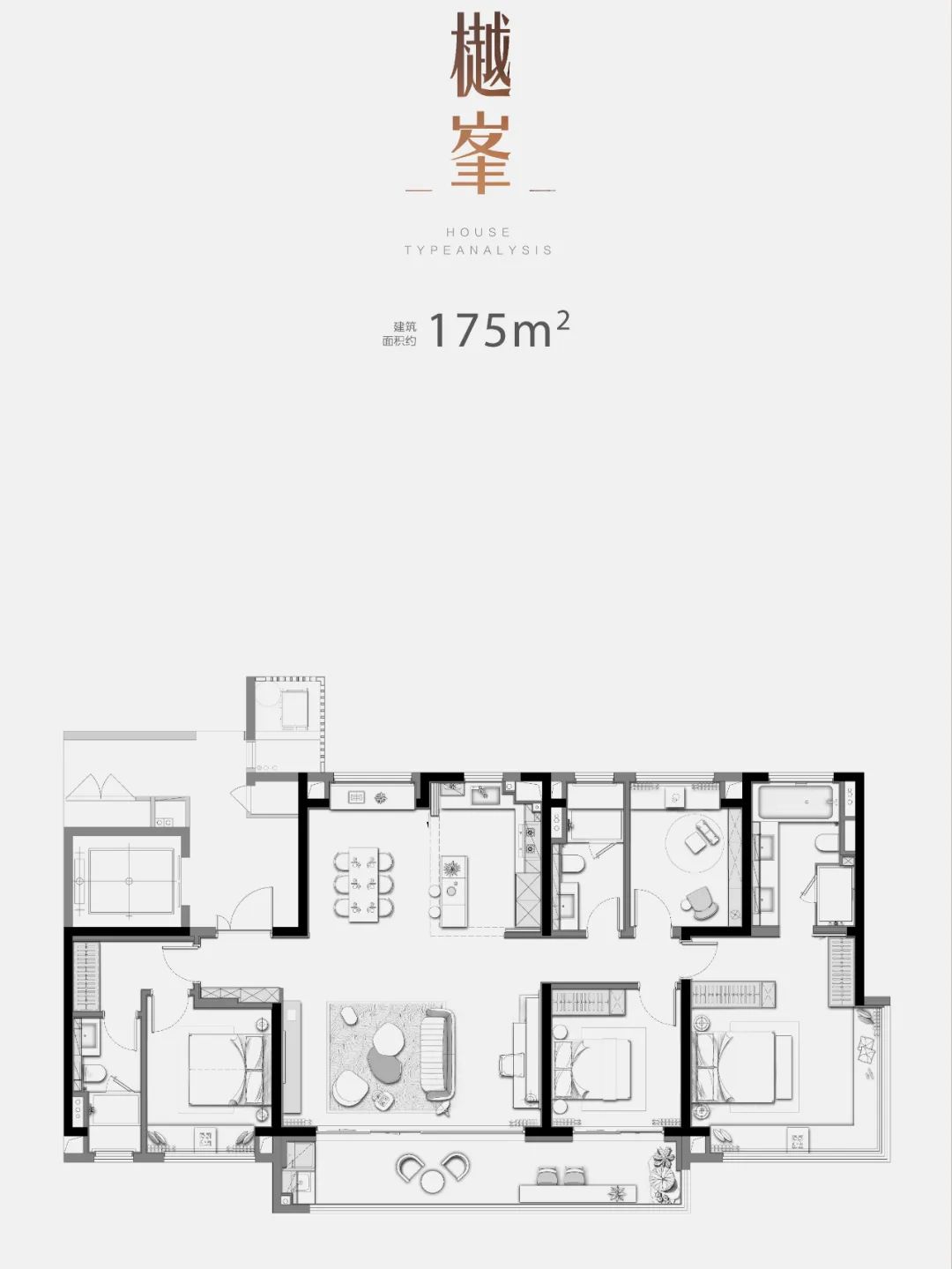 户型特点:建面约268㎡户型,4房2厅4卫设计;LDK一体化设计,客餐厅面积超60㎡,横厅面宽约7.2米;南北双阳台,南向阳台开间约10.6米;南向三套房,主卧套房约50㎡带独立衣帽间+独立卫浴;主卫双台盆+浴缸设计。