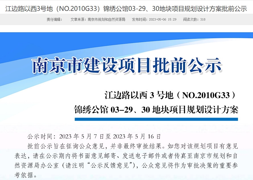 近日,南京市规划和自然资源局发布《江边路以西3号地(NO.2010G33)锦绣公馆03-29、30地块项目规划设计方案批前公示》
