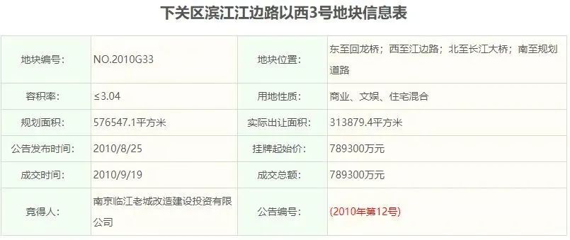 2010年9月19日,南京市下关区滨江江边路以西3号地块由中冶置业集团有限公司持股80%的南京临江老城改造建设投资有限公司竞得,总出让面积为313879.4㎡,竞得价78.93亿元人民币,是当年轰动全国的中冶地王,当时楼面地价约8272元/㎡。