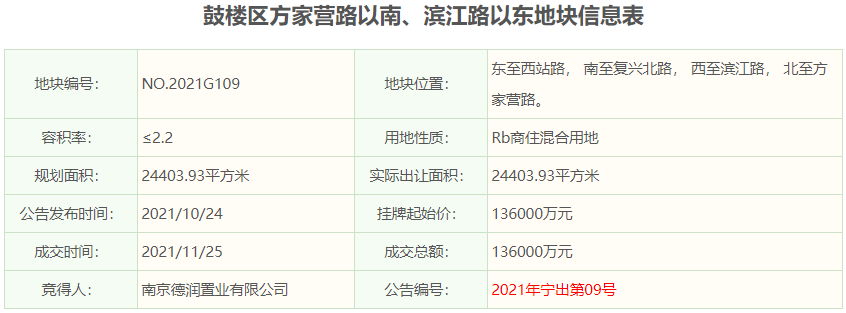 该地块前身为鼓楼滨江G109地块,经过1轮竞价,被金基拿下,拿地总价约13.6亿元,楼面地价25331元/㎡,毛坯限价40950元/㎡。