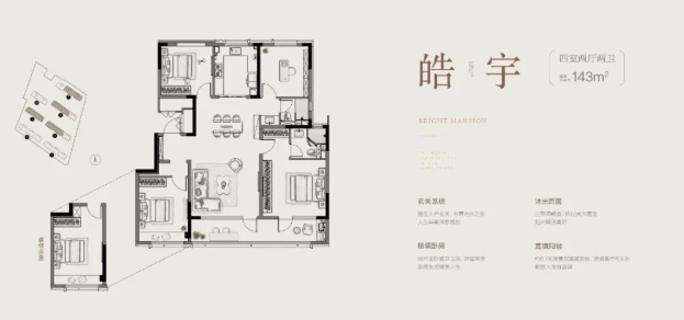 建面约143㎡四室两厅两卫:该户型空间的利用率很高,主卧是明卫,南向次卧有超大飘窗。