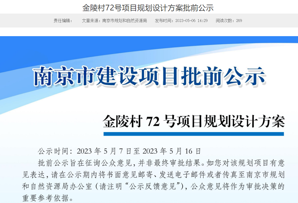 同时,南京市规划和自然资源局还发布了位于鼓楼铁北的金陵村72号项目规划设计方案批前公示。