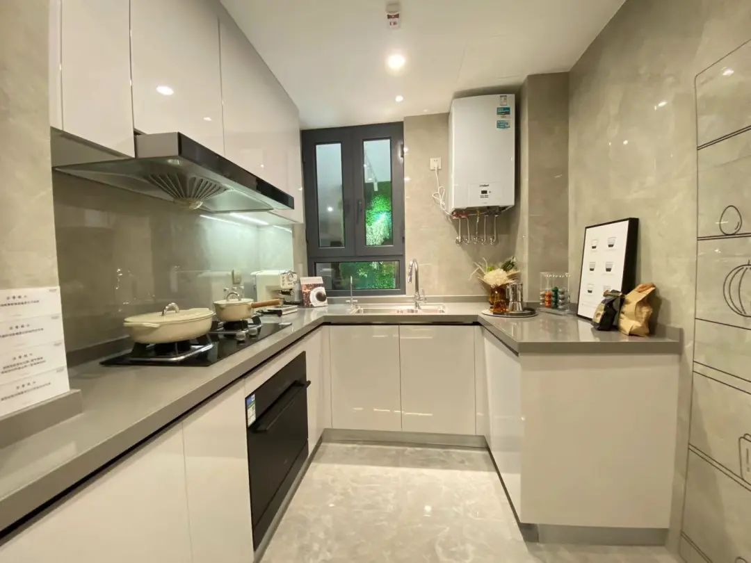 U形厨房设计,配备了净水器、垃圾处理器、洗碗机,并且均为老板、方太或同等档次品牌。