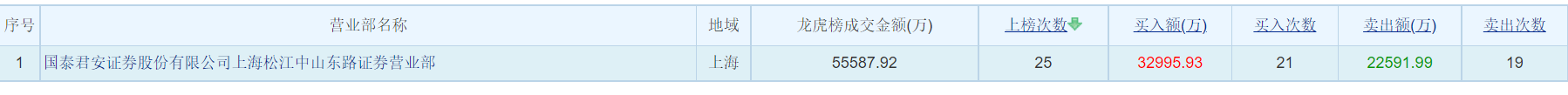 国泰君安上海松江中山东路证券营业部两年内上榜次数也达25次。