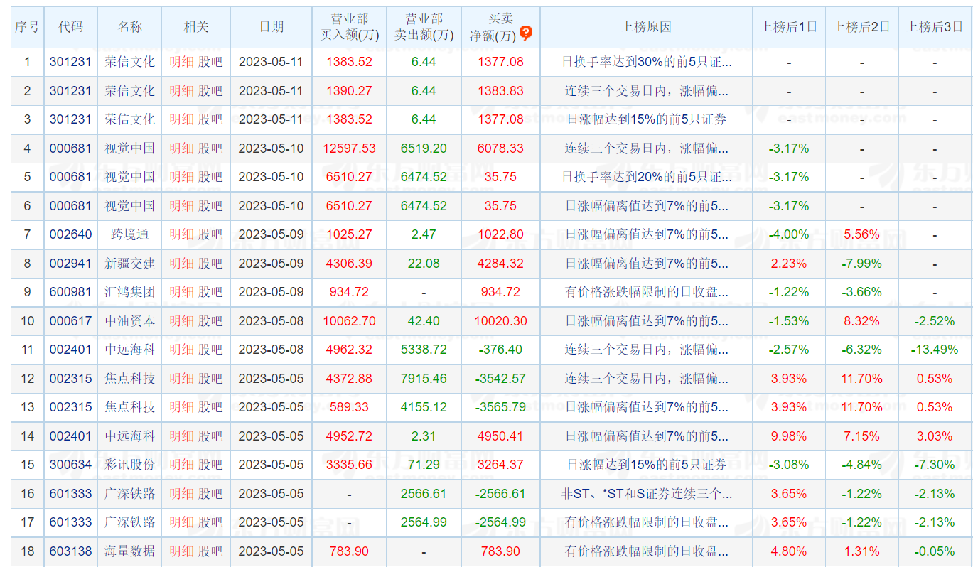 近1个月该营业部上榜成交总额高达60.56亿元,近1年上榜成交总额高达690亿元。进入5月在6个交易日内爆炒的股票高达128只。5月11日除260万元买入容信文化,720万元卖出外;还爆炒了AIGC概念股视觉中国(000681.SZ),买入额超3200万元,卖出额超2370万元。