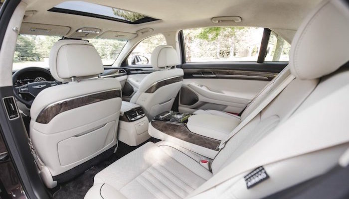 G90的内饰包裹如果不是一流,也在一流附近。新车提供两种内饰选择:黑色或者米黄色皮革。事实上,任何一辆G90上面都不存在传统的那些选择。你自己选择发动机、后驱或者全驱系统,自己从6种内饰配色方案中选择1种颜色——其中4种灰度,外加棕色以及蓝色。在V-8车型上,LED前照头灯、柔软的电动通风后排座椅是它的亮点。无论哪一种配色方案,你都会得到数不清的木纹与金属装饰、软性皮革、帅气的滚花旋钮以及温和的LED氛围照明。一些和现代车型共享的按键,流露出挥之不去的廉价气息,有些伤害整车的豪华调性。