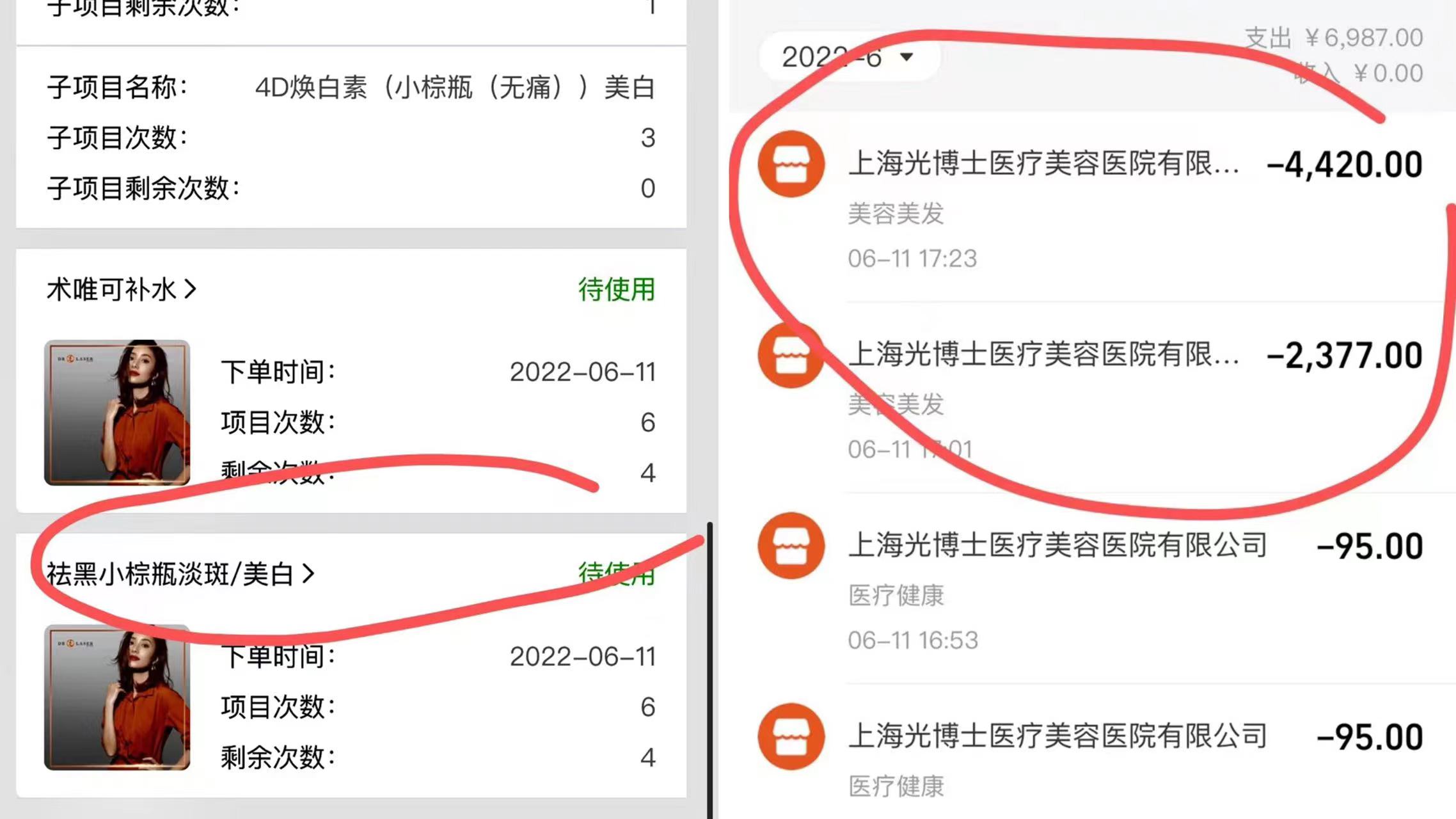据赵女士介绍,在2022年6月11日,她在上海光博士购买了六次“术唯可补水”、“祛黑小棕瓶/美白”项目;消费记录显示其当日付款为2377元、4420元。不过,赵女士表示,由于时间久远加之其还有光电项目,所以项目的具体价格信息其记得不太清楚。
