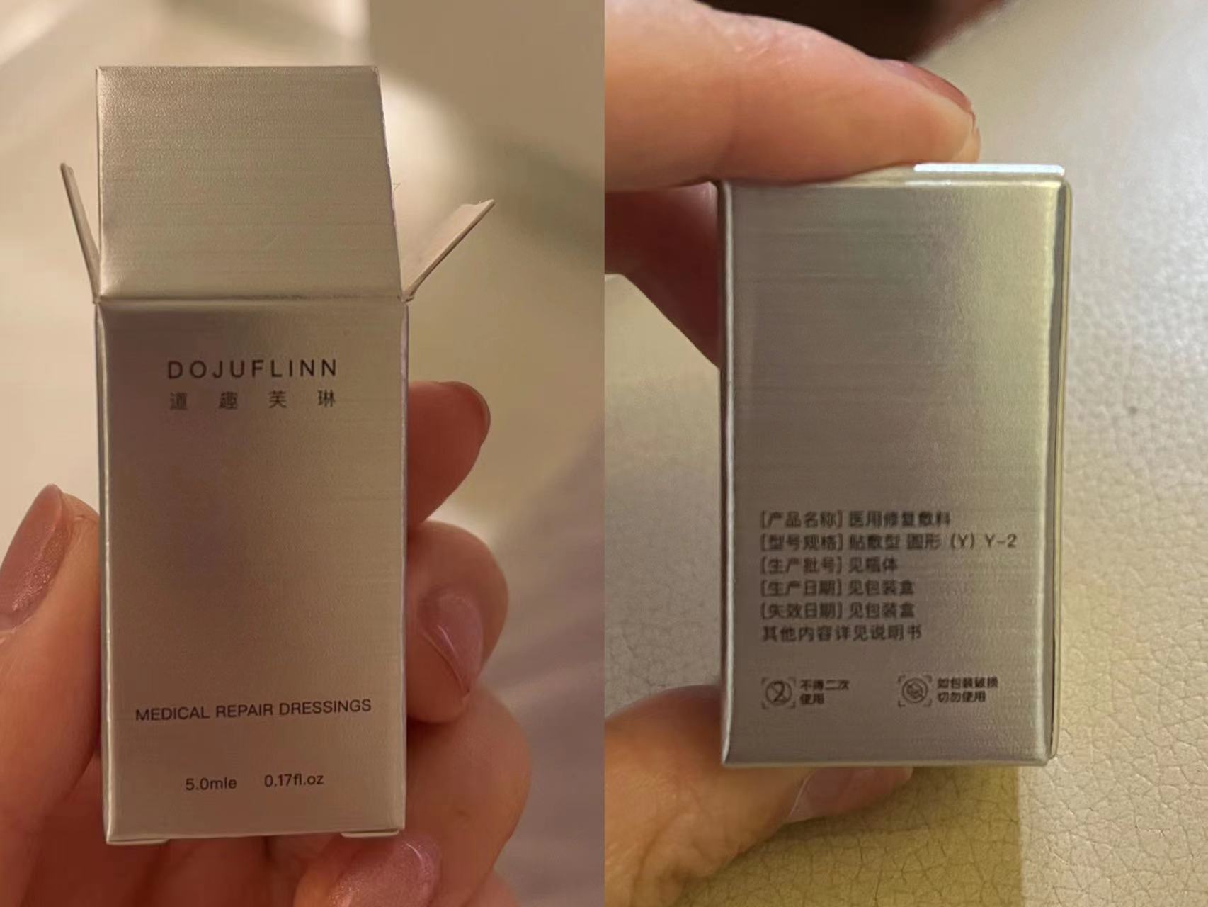 依据赵女士提供的产品包装盒,这是一个银灰色的包装盒。其中,有一面写着该款产品的商标名“道趣芙琳”;另一面写着产品名称为“医用修复敷料”,型号规格为“贴敷型 圆形(Y)Y-2”。