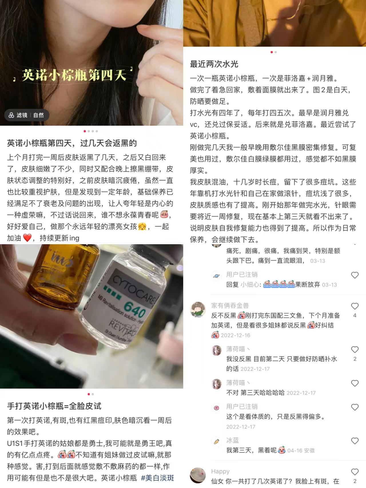 赵女士做的水光针项目是近年国内较火的医美项目。而在社交媒体上,有关于英诺小棕瓶的声音并不少。