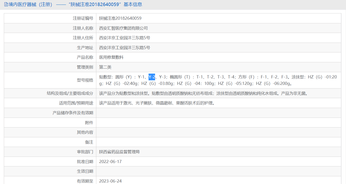 当前,若是在国家药监局检索“医用修复敷料”,仅有八款产品的显示了获批信息。其中,若是规格满足“贴敷型 圆形(Y)Y-2”这一条件,就只有注册编号为“陕械注准20182640059”,注册人名称为“西安汇智医疗集团有限公司”的一款产品。