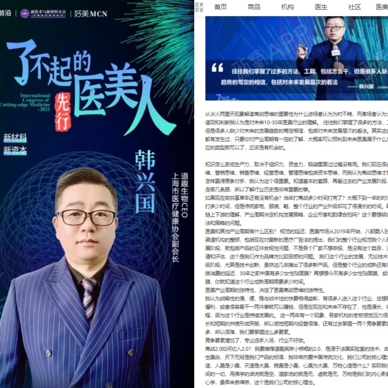 据“2021首届全球医美前沿产业大会 了不起的先行医美人”会议海报,韩兴国系道趣生物首席执行官,其同时还是上海市医疗健康协会副会长。