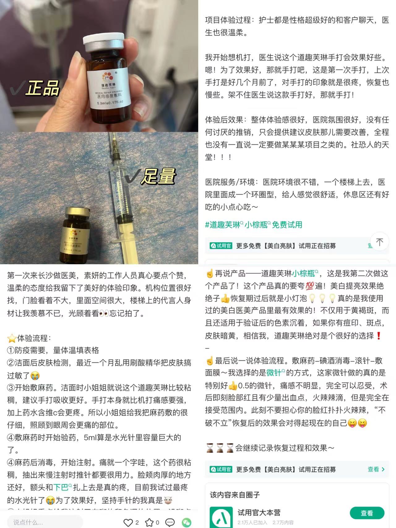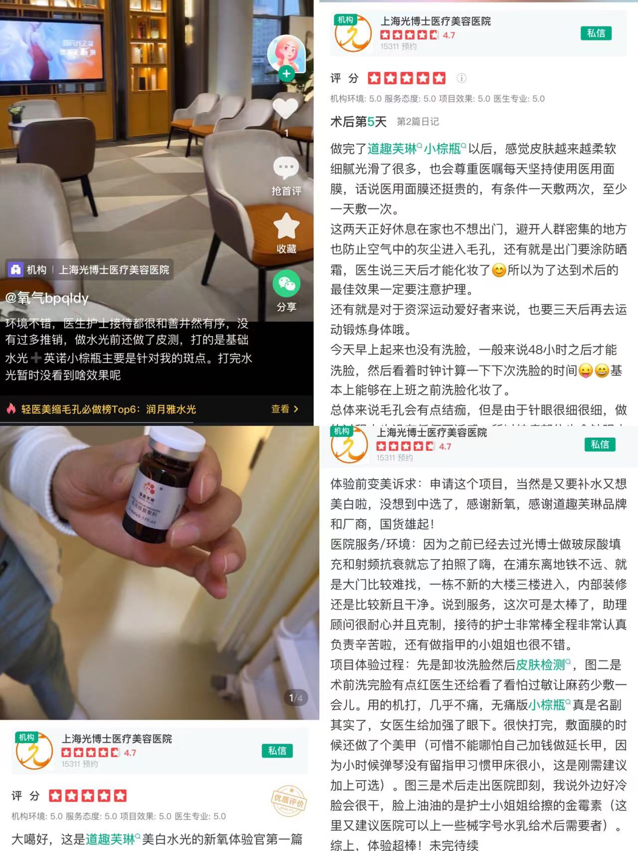 另据社交媒体,上海光博士医疗美容医院进行的“英诺小棕瓶”或者是“道趣芙琳小棕瓶项目”都不是个例。当前,在社交媒体上,有不少用户晒出了体验评论。