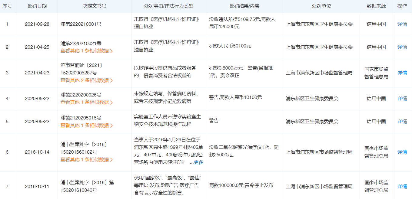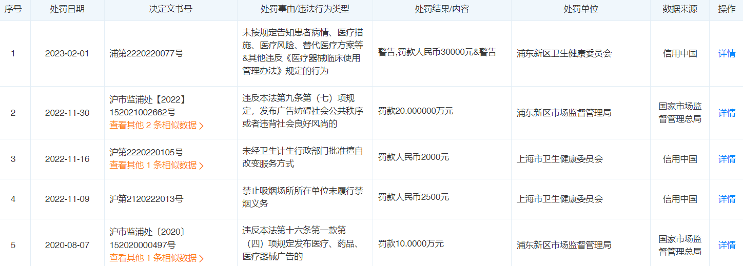 不过,天眼查的信息也显示,上海光博士的行政处罚实在不少。其中涉及了不少违规使用医疗器械、违规进行广告发布、不规范执业、侵害消费者合法权益等。