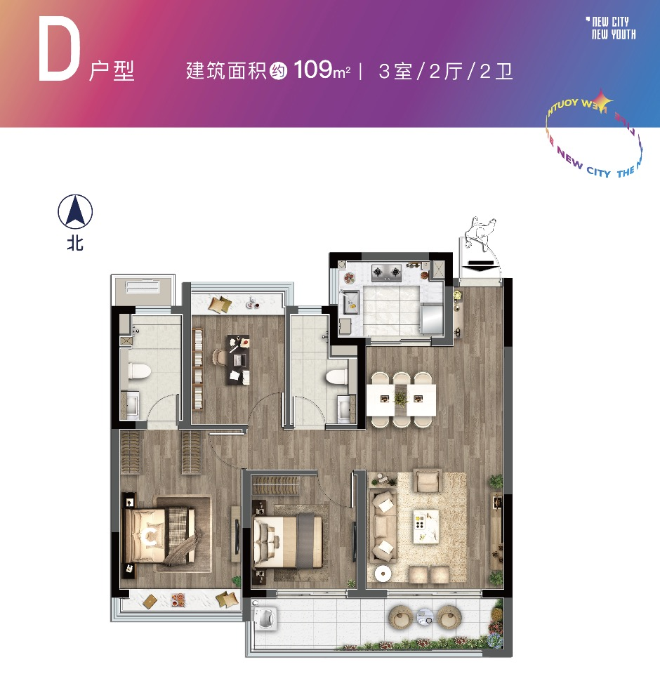建面约109㎡户型:三房两厅两卫设计。该户型朝南双阳台开间尺度达到约6.6米,全封闭交付。室内空间宽敞阔绰,主卧套房设计,带独立卫浴,预留步入式衣帽间空间,私密性与尊享感更强。
