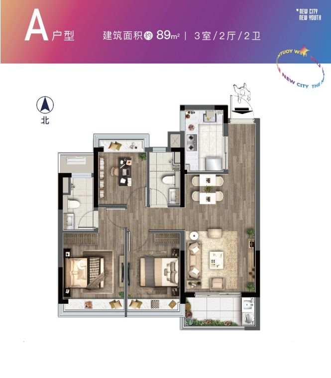 建面约89㎡户型:三房两厅两卫设计。该户型主卧做到了套房设计,这在建面约90㎡以下的户型市场很少见。另外,该户型的三个卧室均带飘窗,保证了很好的采光。