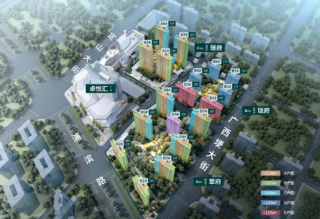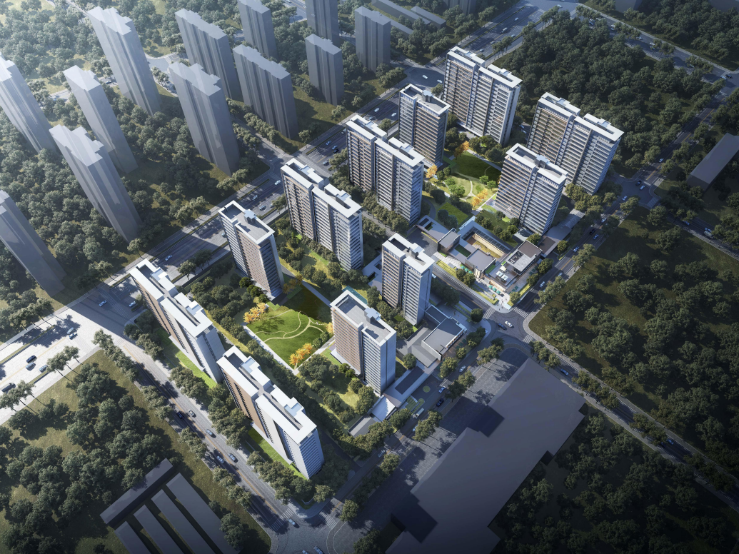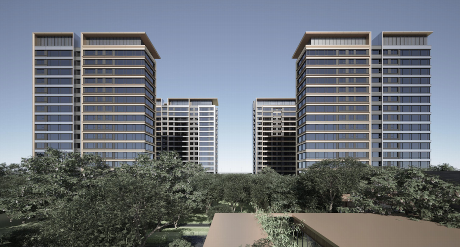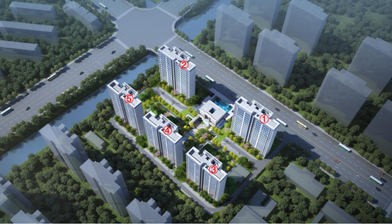 根据效果图显示,这5栋楼都采用了首层局部架空的设计,整体为简约现代的风格,外立面采用大面积玻璃材质,搭配银色铝板。