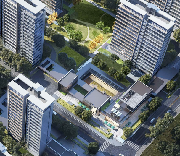 根据效果图显示,这11栋楼都采用了首层局部架空的设计,另外,项目还打造了一个下沉庭院。