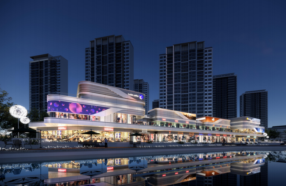 项目自带的2F滨水商业体设计感十足,昭示面积大。