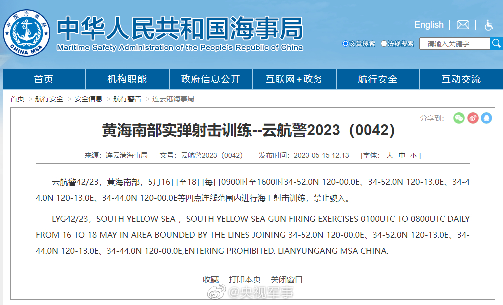 据中国海事局网站消息,连云港海事局发布航行警告,5月16日至18日每日9时至16时,黄海南部部分海域进行海上射击训练,禁止驶入。