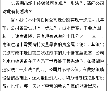 该公司还称,“如果能快速实现‘一步法’的话,公司并不那么傻,在做好镀膜设备的基础上,还大量投资人力、物力研制磁控溅射设备。也许,哪一天这‘皇帝的新衣’真的能造出来。”