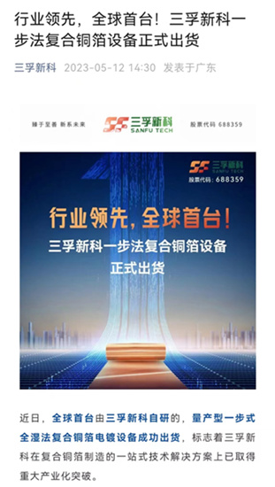 三孚新科5月12日在公众号上发文称,“一步法复合铜箔设备正式出货”。公号文章称,近日,全球首台由三孚新科自研的,量产型一步式全湿法复合铜箔电镀设备成功出货,标志着三孚新科在复合铜箔制造的一站式技术解决方案上已取得重大产业化突破。