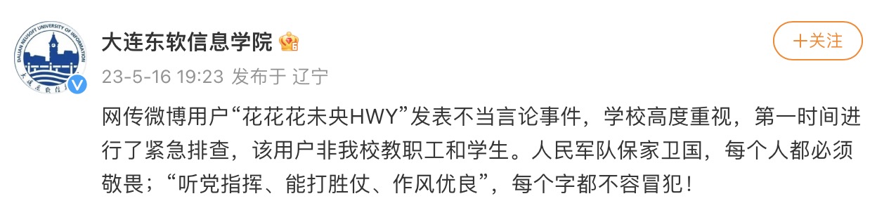 5月16日,大连东软信息学院表示称,网传微博用户“花花花未央HWY”发表不当言论事件,学校高度重视,第一时间进行了紧急排查,该用户非该校教职工和学生。
