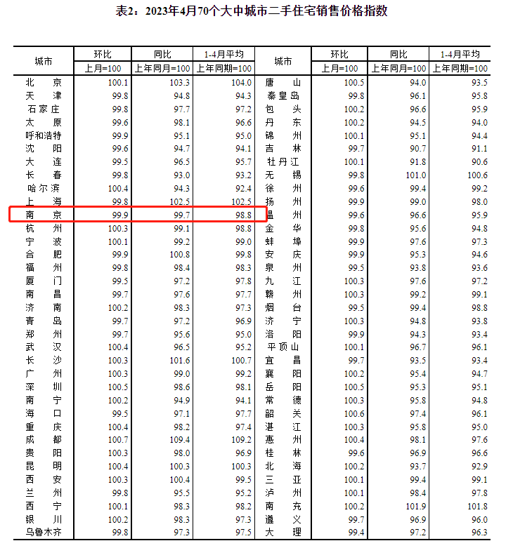 今天上午,国家统计局最新发布了2023年4月份70个大中城市商品住宅销售价格变动情况统计数据。其中,4月南京新房价格环比上涨0.5%,同比上涨1.2%,二手房价格环比下跌0.1%,同比下跌0.3%。这是自今年2月以来,新房价格连续第三个月上涨!