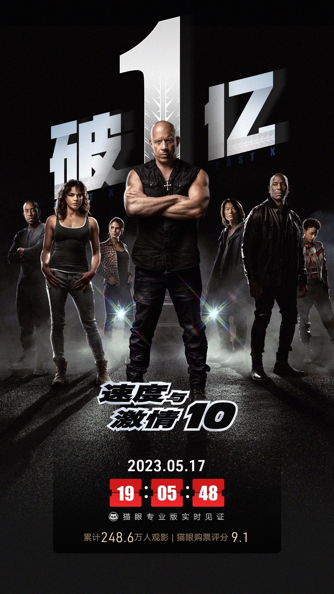 5月17日,猫眼专业版数据显示,电影《速度与激情10》上映首日,内地总票房突破1亿元。