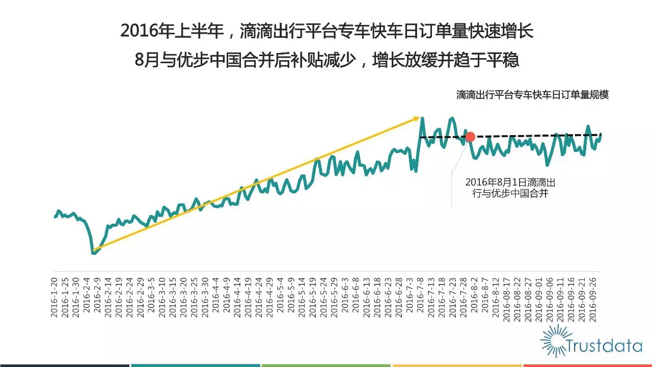 有意思的是,今年8月份滴滴收购优步中国后,逐渐削减了补贴方面的投入,这种变化比较明显的体现在了订单上。从数据上看,滴滴的订单增长趋势从8月份开始放缓并趋于平稳,说明虽然补贴降低了,但规模还是基本保住了。