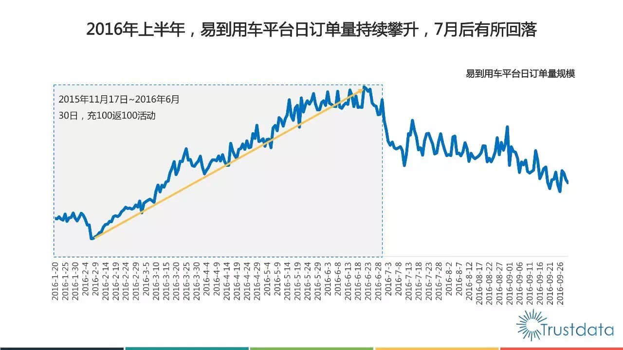 今年上半年,易到用车平台的日订单持续攀升,在6月达到顶峰,但从7月份开始逐渐回落。说明“生态充返”的力度下降之后,对其订单影响还是比较大的。之前易到官方6月份公布的数据显示,易到的日完成订单数当时已突破100万。
