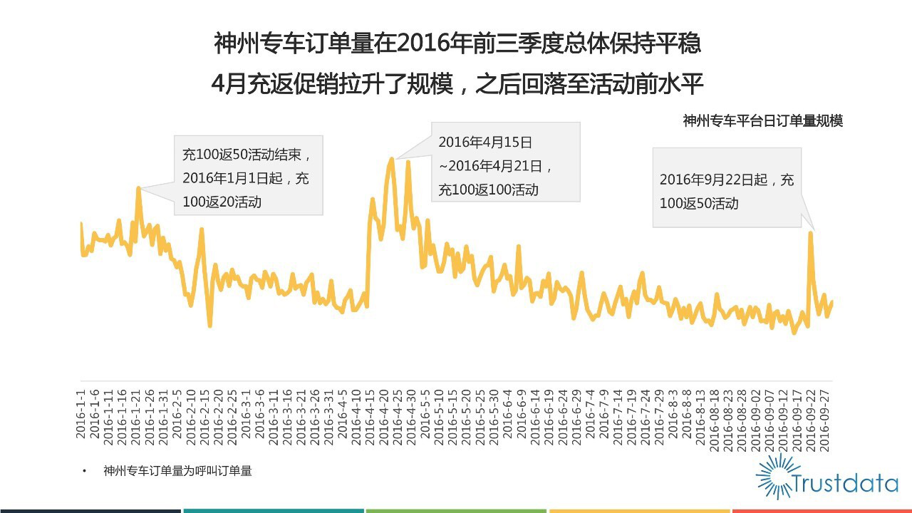 从2015年年初开始,依靠大额的充返促销活动,神州的日活跃用户增长非常明显。今年前三季度,神州专车的订单量总体保持平稳。今年4月份的大规模充返促销活动帮助神州拉升了订单规模,之后逐渐回落至活动前水平。