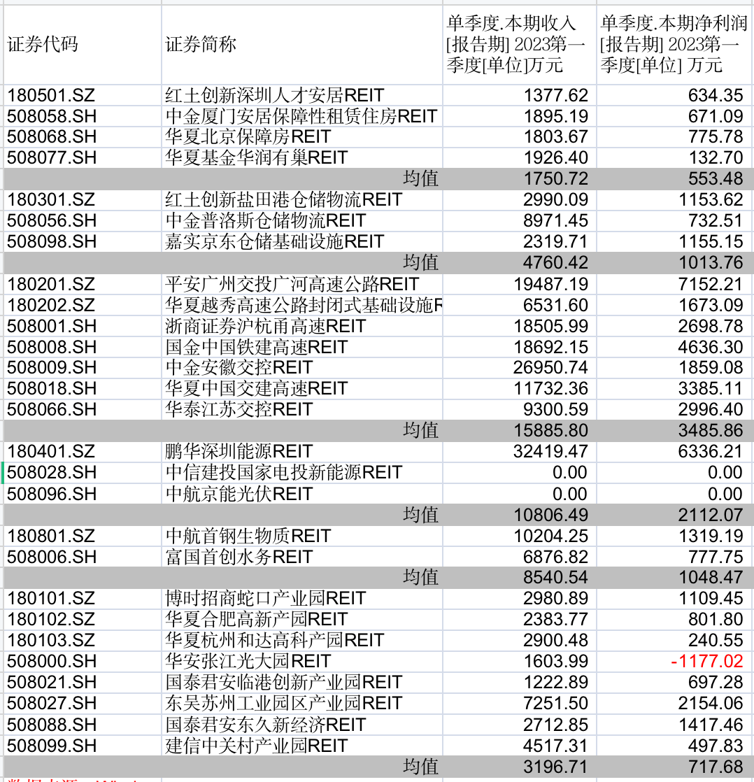 从净利润绝对值看,交通基础设施类Reits占据前五中四席,平安广州交投广河高速公路REIT位居第一,净利润7,152.21万。国金中国铁建高速REIT、华夏中国交建高速REIT、华夏江苏交控REIT位居第三、四、五位,净利润分别是6,336.21万、3,385.11万元、2,996.40万。交通基础设施类REITs平均每只净利润3485.86万元,是一季度净利润均值最高的项目类型。