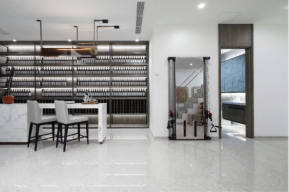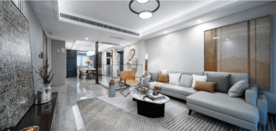 整个餐客厅空间约58㎡,客厅开间约6.6米,加之约3.1米的层高、通铺简一瓷砖,调调奢华感扑面而来,十分气派。(以开发商最终交付为准)