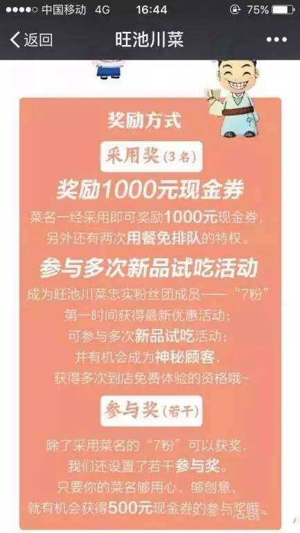 旺池川菜推出春季菜品时,在微信举办了新品征名活动。顾客根据旺池提供的菜品材料、味型和特点进行取名,被采纳的话奖金是1000元的现金券,以及两次免排队的特权。名字没有被采用的也可能获得500元的现金券。