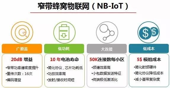 第一,过去物联网标准不统一的问题比较严重。不单在传感器层面,在通信层面的标准也是五花八门。2016年6月份,在3GPP的标准会议上,通过了一个窄带物联网的核心协议标准,它定位于在运营商许可的频段,比如200kHz的频段里面,利用OFDMA和单窄波的FDMA技术组织物联网,极大地满足了低功耗广域物联网的需求。总体来讲,它有四大优势:一是广覆盖。NB-IOT技术(Narrow Band Internet of Things,基于蜂窝的窄带物联网,正和岛注)能够实现比GSM好20dB以上的覆盖增益,因而覆盖面积扩大100倍,比如原本的信号死角像地下车库、地下管道等都可以覆盖到;二是大连接,即NB-IOT单扇区可以支持5万个连接,比现有的2G/3G/4G网络高50倍。如果全球有约500万个物理站点全部部署NB-IOT,每个站点三扇区可接入的物联网终端数将达4500亿个;三是低功耗,即NB-IOT终端如果每天发送一次200Byte报文,AA电池待机时间10年;四是低成本,目前单个连接模块的成本是5美元,只要上规模成本很快就会下降到1美元。