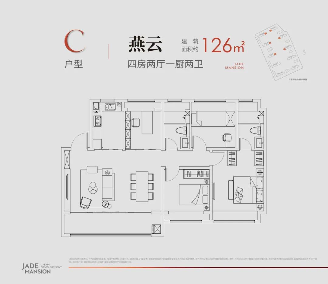 建面约126㎡户型:是建面约120㎡户型的进阶版,四房两卫,拥有约6.6米超大横厅,尺度更加朗阔,居住舒适度更佳。