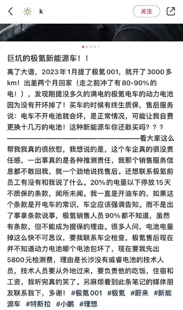 车主在文中还对极氪的“20%电量以下停放15天不质保”的条款进行了声讨。他认为,如果这个条款是开电车的常识,汽车公司应该强调告知,而不是出了事拿条款说事。“极氪销售人员90%都不知道,虽然有条款,但不能成为拒保的理由。”目前,网上的相关内容已被发布者删除。