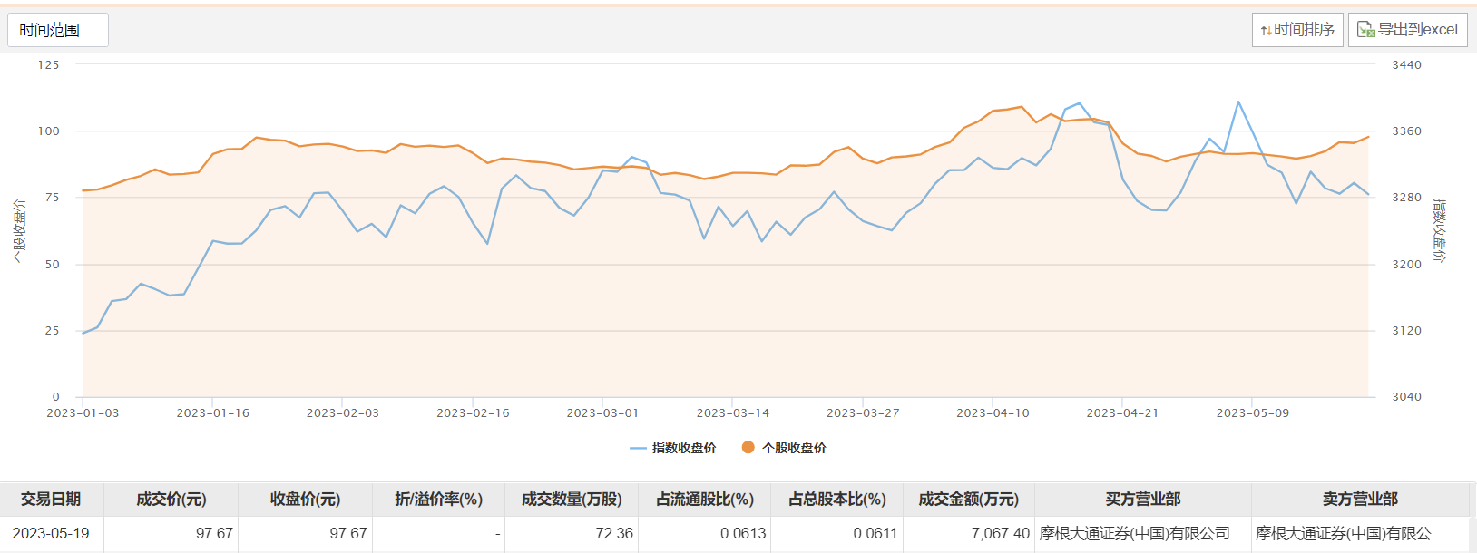 5月19日,韦尔股份大宗交易成交72.36万股,成交额7067.4万元,占当日总成交额的5.3%,成交价97.67元,较市场收盘价97.67元持平。