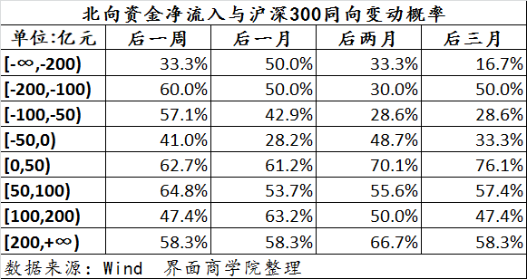 从历史数据来看,北向资金2016年7月以来单周净流入均值约为53亿元。当北向资金净流入位于均值附近区间时,沪深300指数同向变动概率较高,后一周、后一个月、后两个月以及后三个月上涨概率均超过60%。