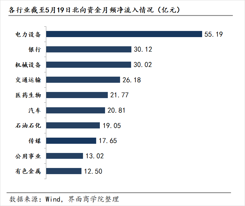 以申万31个一级行业为基准,Wind数据截至5月19日的月频申万一级行业数据显示,北向资金流入显著的前三板块分别为电力设备、银行以及机械设备,月流入分别为55.19亿元、30.12亿元和30.02亿元。而北向资金撤出的前三板块分别为家用电器、非银金融以及食品饮料,月流出分别为46.99亿元、46.94亿元与40.44亿元。