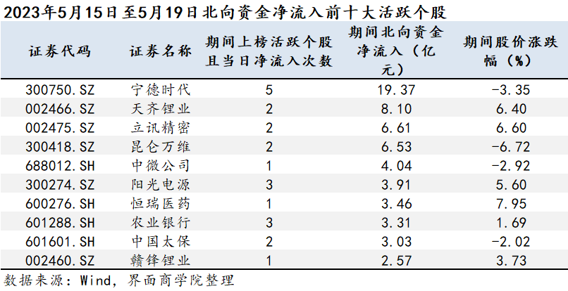 从北向资金活跃个股净流入金额上看,宁德时代(300750.SZ)、天齐锂业(002466.SZ)、立讯精密(002475.SZ)为5月第三周北向资金净流入的前三。