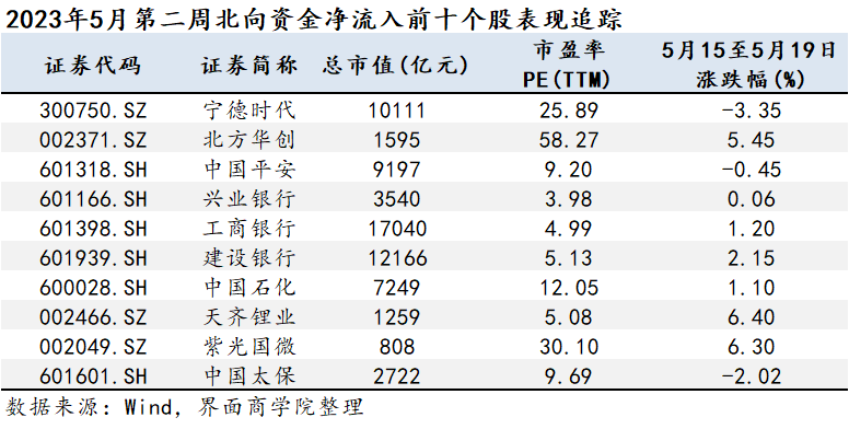 下图为上期2023年5月第二周(截至5月12日)北向资金净流入前十大个股的后续表现情况。数据截至2023年5月19日,追踪区间为2023年5月15日至5月19日。排序以上期资金净流入为基准。