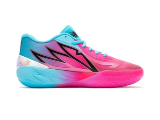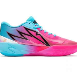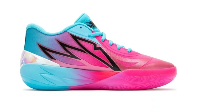 彪马MB.02篮球鞋以亮湖蓝和玫红色为主色调,在球场上十分亮眼。设计上,篮球鞋的中底两侧有代表拉梅洛·鲍尔的火焰logo,风格独特。