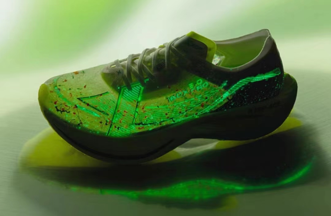 据特步介绍,新鞋款鞋身喷绘采用夸克吸光工艺的蓄光油墨,白天吸收紫外线,夜间保持荧光状态。
